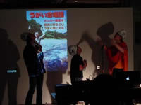 今日は昨日に続いてプロジェクト参加者の紹介その2。発表したのは塚脇さん、Tamaちゃん、鳴海さん、AKJのHIROSさん、JOEさん、久万君、萩野さん。それぞれ、自分の作品や考え方について発表していく中、JOEさんが企画したうがい合唱団(頭におむつをかぶり、口に水を含んでうがいをしながらみんなで歌を歌う。キャッチコピーは『普通に歌うよりうまく聞こえる!』たしかにトレモロがかかって、誰でもきれいな?音が出せる)のパフォーマンスがやたらみんなにに受けていました。