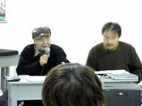 村岡氏と、聞き手の塚脇さんの登場。大先輩を前に塚脇さんも緊張気味でした。村岡さんのお話はユーモアたっぷりで、でも、話の要所要所にちゃんと筋が通ってて、しかもパワフルでした。