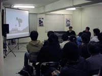 今回のイブニングアートパーティーは村岡三郎の話。前回とは違って見に来るお客さんも、まじめに美術の話を聞こうという人が多いようです。