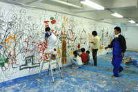 「アート林間学校2005」 2日目にあたる午後、なんとも簡単に元気のいいウォールアートが仕上がった。