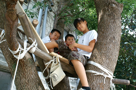 15人の小学生との暑い3日間でした。基地作りも年々と素材や手法を変えてきたのですが、今年は北岡君とも相談して、当初のように木材や竹を与えて、トンカチ、ノコギリで好きなようにトンカンやってもらうことにしました。表の木の上に一つ、裏の渡り廊下の下に一つ、上の渡り廊下とその上下に一つの3つの基地ができました。作っても持って帰れるわけでもないし、たびたび基地として遊びに来れるわけでもないのに、子どもたちは真剣そのものでした。やはり、作ることで発散できることに一番ポイントがあるようです。