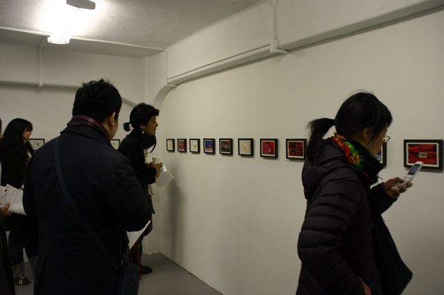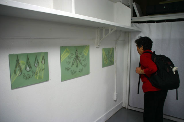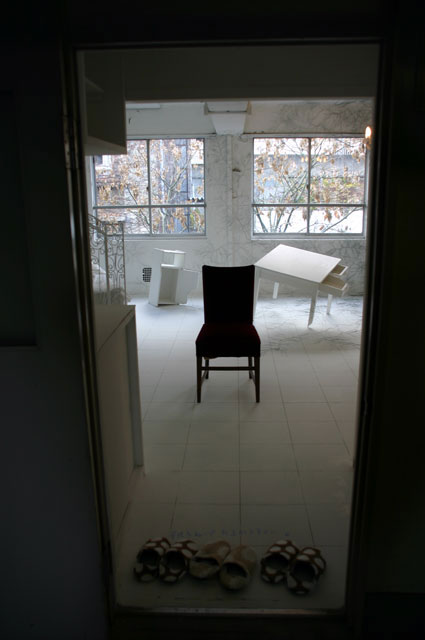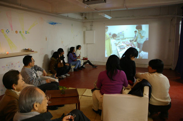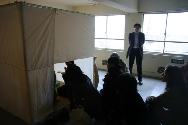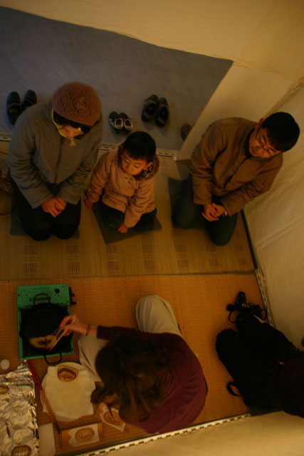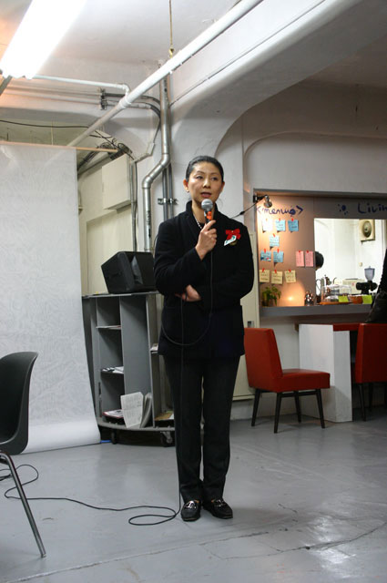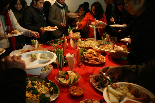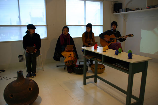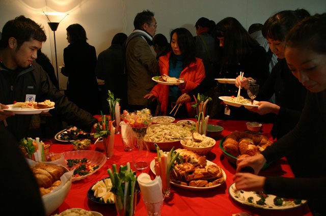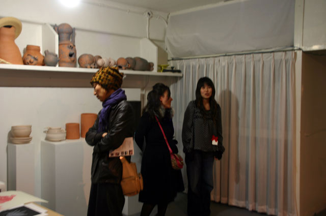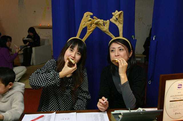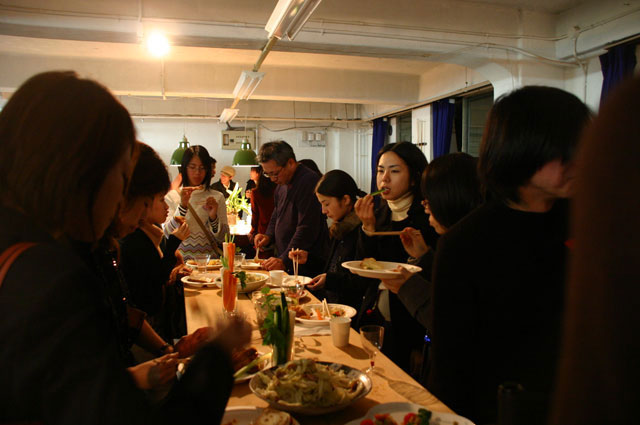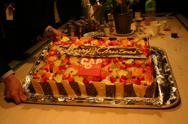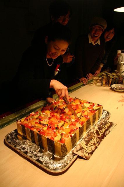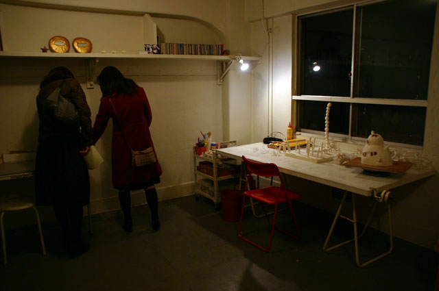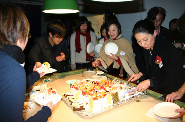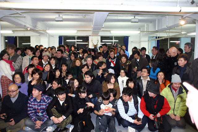 あっという間に過ぎていったCAPHOUSEの8年間。このプロジェクトの最後はやっぱりみんなで集まってパーティーだ、ということで今年のクリスマス会はオープンスタジオ&展覧会&パーティーです。この日最初のプログラムは3時からのイザベル・メリオさんのパフォーマンス。ベルギー人の彼女は、3階のちょっとしたスペースにテントでできた茶室みたいなしつらえ、そして「幸」の字を型抜きしたポテトを揚げて、来られた方に「型抜きした部分を埋めるアナタの気持ちを用意して食べて下さい」といって渡します。なんだか既に昼頃からいつになくたくさんのお客さまでにぎやか!?幸せポテトには順番待ちの列ができました。そうこうしているうちに、4時。アトリエで展覧中のベロニカ・ドバスさんのトークが始まりました。 彼女はドイツ人。隣の部屋でやはり展覧会を開いた山村幸則さんが通訳で助っ人してくれました。反対隣の部屋からは打楽器の音。4時半からの中村由紀子展&ムビラコンサートです。この日は他にも4階で一部屋全部作品にしてしまった藤川玲子展、裏の工作棟では鉄の彫刻家、塚脇淳さんの作品展、そして夕方6時からは2階のギャラリーで大西正一さんと高濱浩子さんのふたつの展覧会オープニングとトークがありました。この頃には館内どこも人で一杯です。ようやく受付も始まり、7時からリビングルームでパーティーが始まりました。