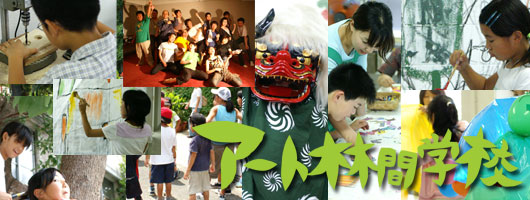 第六回のアート林間学校!今年はこれまでで一番のボリュームになりました。なんとご近所の日本庭園「相楽園」でも講座開催!その他、ガムラン音楽、乙女凧、茶わん打楽器、陶とガラスの風鈴、エアギター部、なんと全部で37講座です。そして夜には大人向けの渋い講座も充実です。好きな講座をじっくり選んで自分の時間割を作って参加してね。