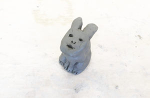 僕の制作としては、素焼きしたものに絵付けして、それから粘土で成形の予定です。粘土では、いくつか変な生き物を作りました。これは、「上を向いたウサギ」です。