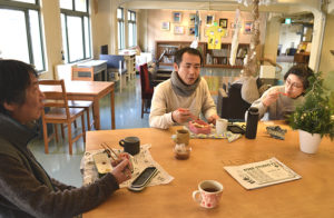 ランチが終わったら、皆、それぞれの仕事。築山君は木を切り、高橋さんはミーティングに備えてコーヒーを入れたり、マスダさんは何やら作業をして、川口さんはミーティング前の準備をしていました。