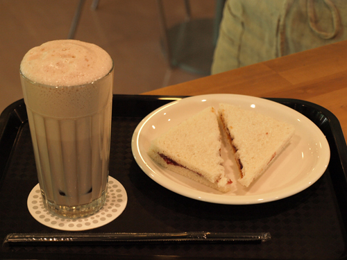 あま〜いピーナッツバターとグレープゼリーのサンドには、やっぱりあま〜いチョコレートドリンクがとても合います!