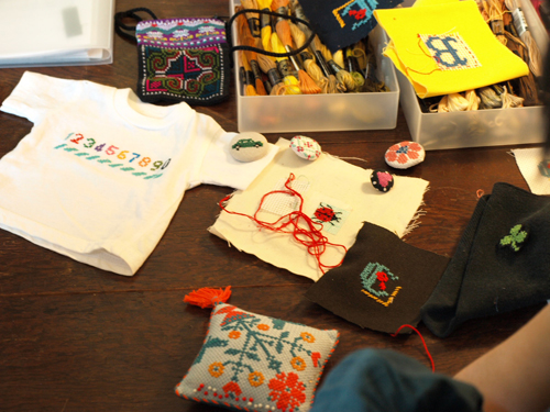 今回は、クロスステッチを習います。xx刺繍でTシャツやエコバック、ハンカチなどにワンポイントを付けて