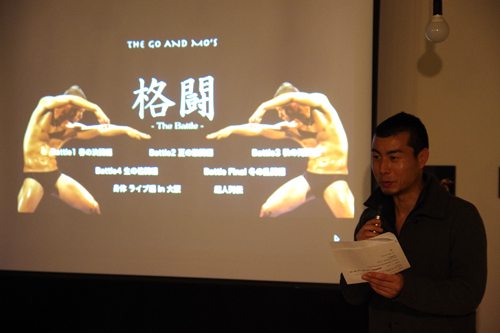 カフェバトル『格闘~The Battle』宮崎宏康 in THE GO AND MO'S 2014年3月15日(土)18:00~ 話者:宮崎宏康(アーティスト)/ゲスト:THE GO AND MO'Sより黒川猛・丸井重樹 参加無料(要1ドリンクオーダー)怪企画・THE GO AND MO'S「身体~The Body」の続編『格闘~The Battle』。