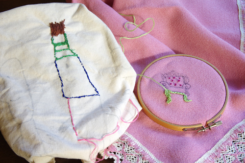 1.好きな図柄(もしくは絵を描いて)を布に転写して刺しゅうで仕上げる