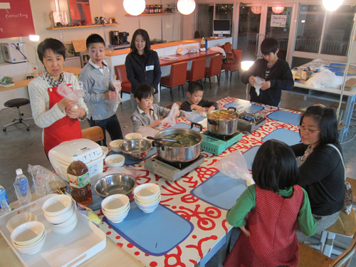 みんなでこねこねしているのは炊きたてのご飯。お楽しみの晩ご飯はきりたんぽ鍋です。