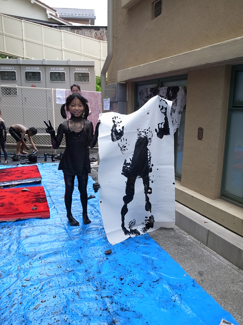 『水浴びして体の墨をおとします。なかなか落ちません。』とチラシに書きましたが、本当に落ちませんでした。講師のヨーコさん含め、みんな黒い顔して帰ってゆきましたが、この出来には大満足です。別の講座に来た子や保護者の方たちも、この屏風の前で記念写真を撮っています。