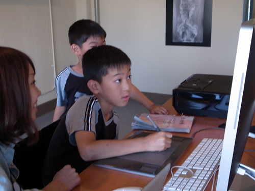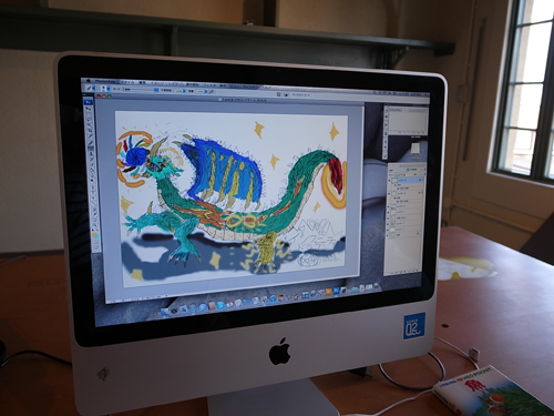 持参の写真や絵の画像を元に、描いたり、塗ったり、切ったり、貼ったりと、歪めたりとコンピュターだからこそできる技の数々を披露。「お母さん、ボクにも買って!!」ってことになってるかもです。