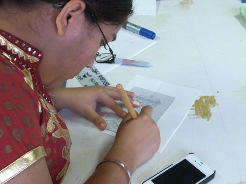まずは塩ビ板をニードルという道具で引っ掻いて版を作ります。