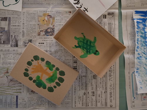 ちょっと厚い紙、薄い紙、紙の箱にも描いちゃいます。提灯にも色を塗りました。