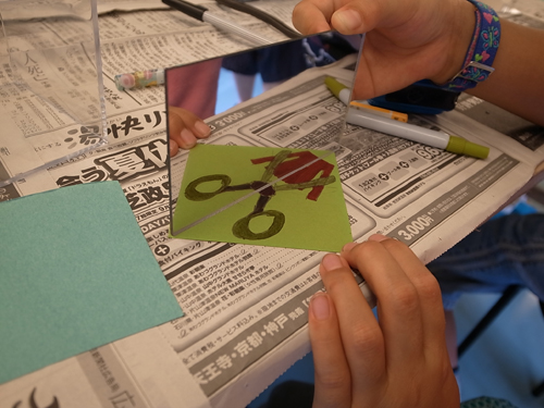 色紙に絵を描いて写すと違う絵になったり、読めない文字が読めたりと
